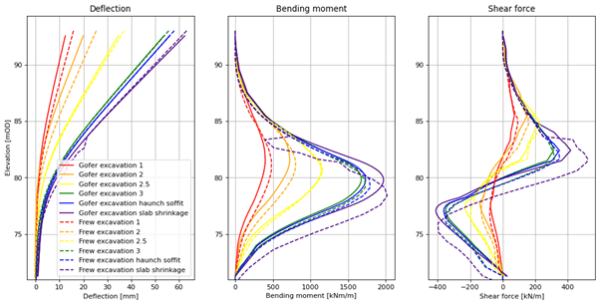 总体而言,Gofer 的结果令人鼓舞,与 Frew 的结果非常吻合,尤其是在后期开挖过程中。对于工程师来说,构建模型非常简单,并且凭借如何结合更复杂的长期效应和故障排除技术的知识,可以自信地模拟具有短期和长期岩土和结构效应的长期施工(10 个以上阶段)。