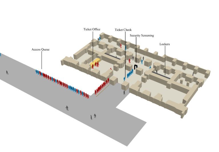 开发了一系列基于模拟的场景来评估不同的运营策略及其对游客流量和体验的影响。每个场景代表了入口操作措施的特定配置,包括票务、安全控制访问分配和人群管理策略的变化。将它们与代表当前操作条件的基线模型进行比较。