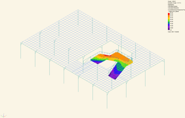 鉴于新楼梯和结构内大跨度的挑战,Aaron和他的团队认识到,能够准确模拟结构的振动性能是规划过程的关键阶段。Oasys GSA在这种情况下被证明是一个非常有价值的工具,因为它能够确定哪些特定方面是关键的,使设计人员能够使用谐波分析来检查结构相对于各种载荷的共振。此外,图形输出支持与客户就可能的绩效和投诉风险进行有意义的讨论。