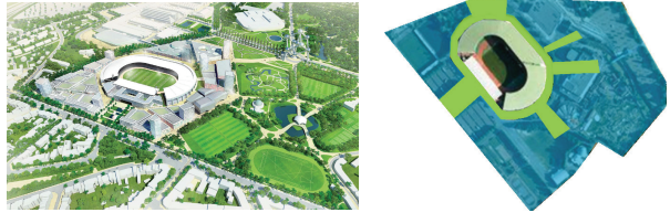 本次分析旨在研究在不影响体育场逃生通道的情况下,体育场周围可开发的潜在空间。此前,体育场周围区域是开放的,紧急情况下,疏散人员时非常方便。拟议的总体规划是在下图蓝色区域的基础上进行建设,并保留绿色区域,用于逃生、紧急车辆通道和交通。