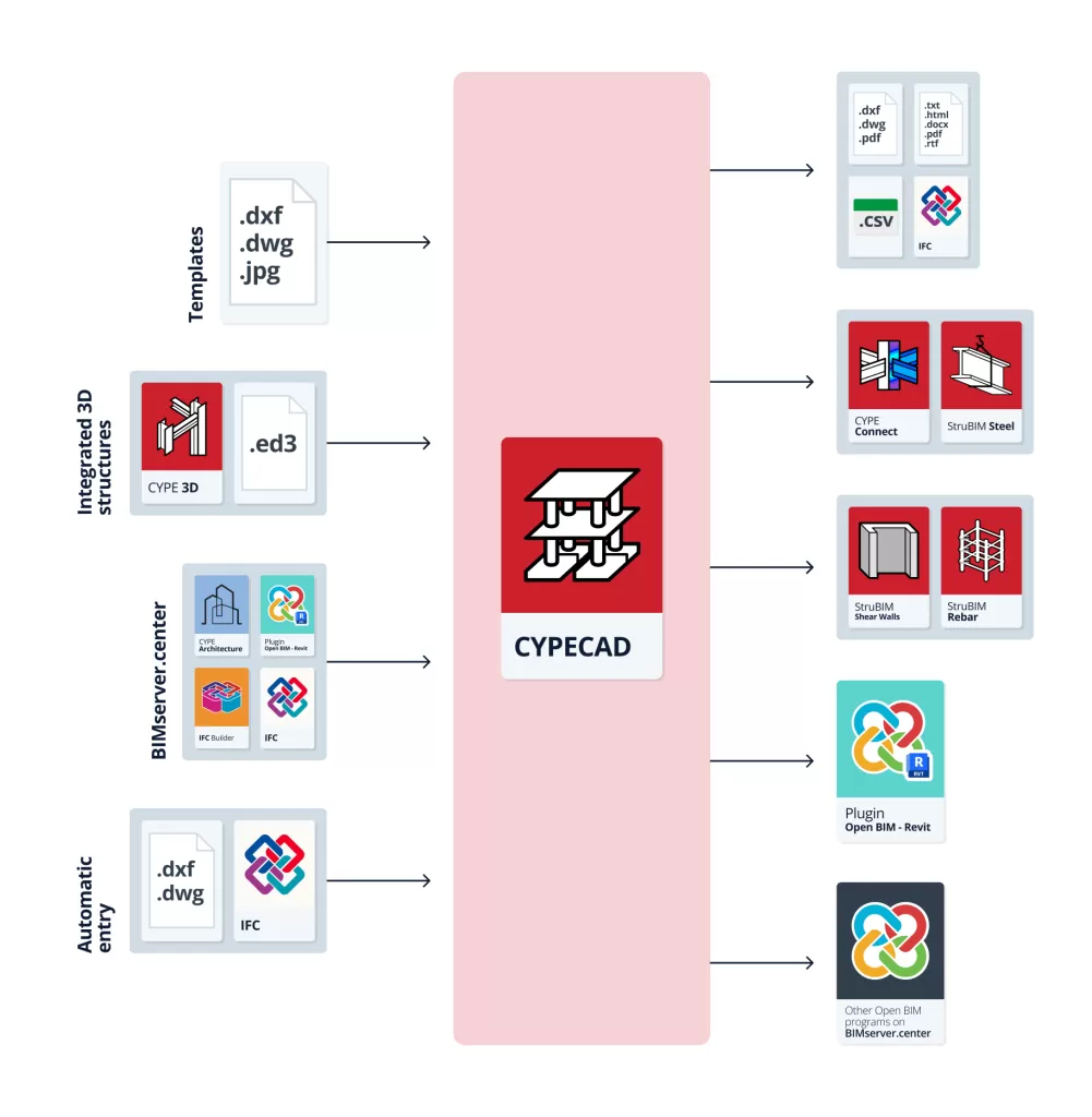 将 CYPECAD 中包含的信息以 IFC 和 glTF 格式导出至 BIMserver.center 平台,确保不同程序之间的互操作性和高效的信息交换。这使得授权的项目参与者可以查看这些信息。CYPECAD 生成的信息可供以下程序使用: