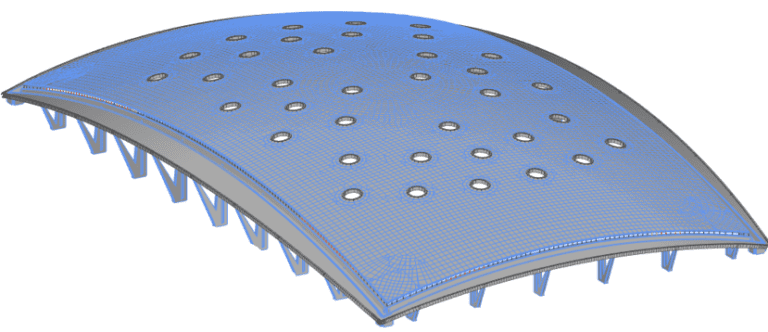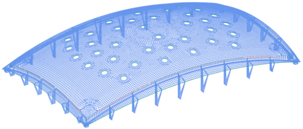 基于测量结果,在Oasys GSA软件中创建了分析模型以反映实际屋顶状况,包括点云测量几何形状、厚度及材料特性。该测量还实现了对找平层荷载的精确评估,相关数据随后应用于详细模型中。找平层厚度随屋顶厚度变化而变化,荷载计算亦据此调整。为评估结构行为,依据现代欧洲规范标准对新建结构进行了详细常规分析。该分析虽能证明结构强度合理,但因开裂导致的刚度损失,导致穿透式屈曲验证失败。为此设计团队采用新方法:通过确定最小可接受安全系数,并开发创新分析方法优化结构评估承载力,最终成功论证结构合理性。