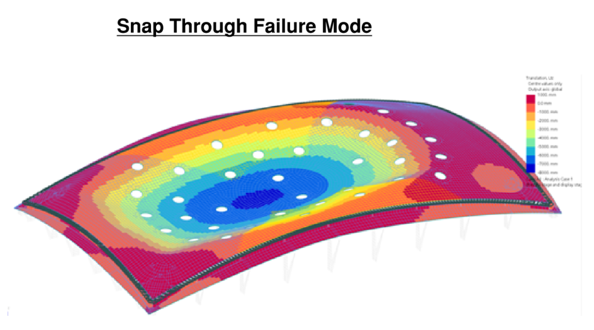 工程师确定可靠性指标目标后,需进行更深入的分析以验证结构在贯穿失稳破坏条件下的整体稳定性。屋顶的刚度与形状对贯穿失稳分析至关重要,必须予以精确考量。有限元分析(FEA)模型采用点云测绘的竣工形状,精确呈现几何形态与厚度。由于结构已承受自重及后张力作用,通过迭代Python工作流确定了调整后的“初始形状”。该初始形状随每组部分安全系数的变化而变化。