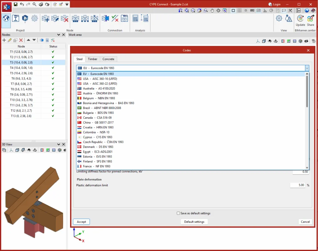 CYPE Connect 拥有丰富的国家和国际规范数据库,可用于钢结构、混凝土和木材连接的设计。这些规范使项目能够根据每个国家或地区的技术要求进行调整。