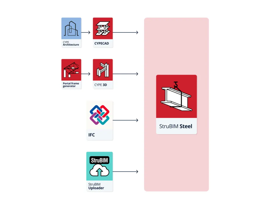 | 除了上述各种功能外,StruBIM Steel 的连接建模选项中还包含与 CYPE Connect 相同的工具。这为两个程序之间提供了另一种有趣的交互方式,用户可以将 CYPE Connect 中创建的连接保存到本地用户库,然后将其导入 StruBIM Steel,反之亦然。 |