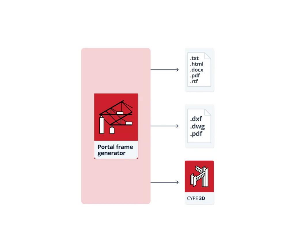 导出到 CYPE 3D。这样,CYPE 3D 可以根据门式刚架生成器中定义的信息、柱的外部连接和钢筋的屈曲长度自动生成门式刚架结构的几何形状、荷载和荷载工况。之后,在 CYPE 3D 中可以进行相应的调整,以完成结构设计并进行分析、检查和设计。