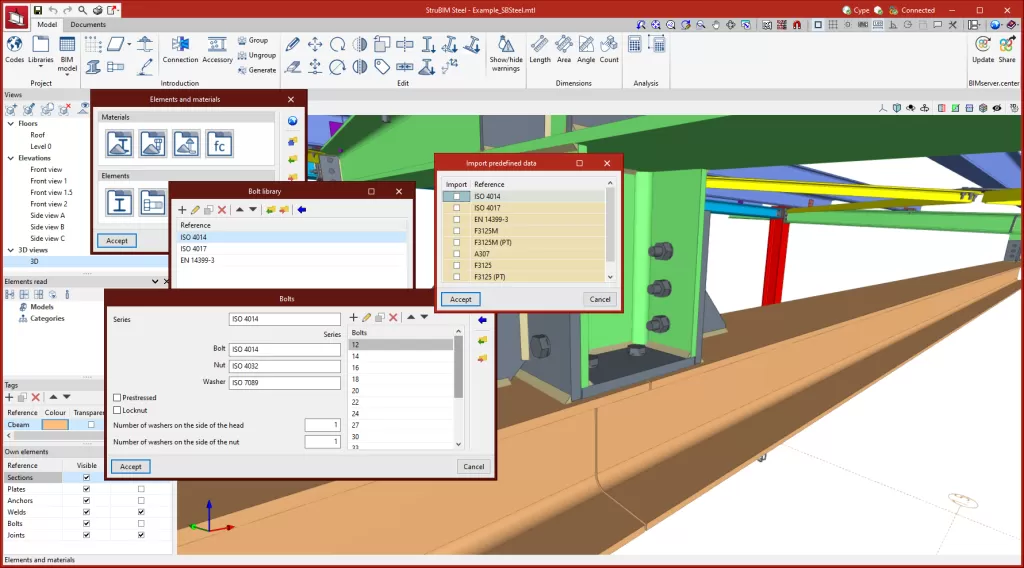 除了上述各种功能外,StruBIM Steel 的连接建模选项还包含了与 CYPE Connect 相同的工具。这使得两个程序之间能够进行另一种有趣的交互:用户可以将 CYPE Connect 中创建的连接保存到本地用户库,然后将其导入 StruBIM Steel,反之亦然。