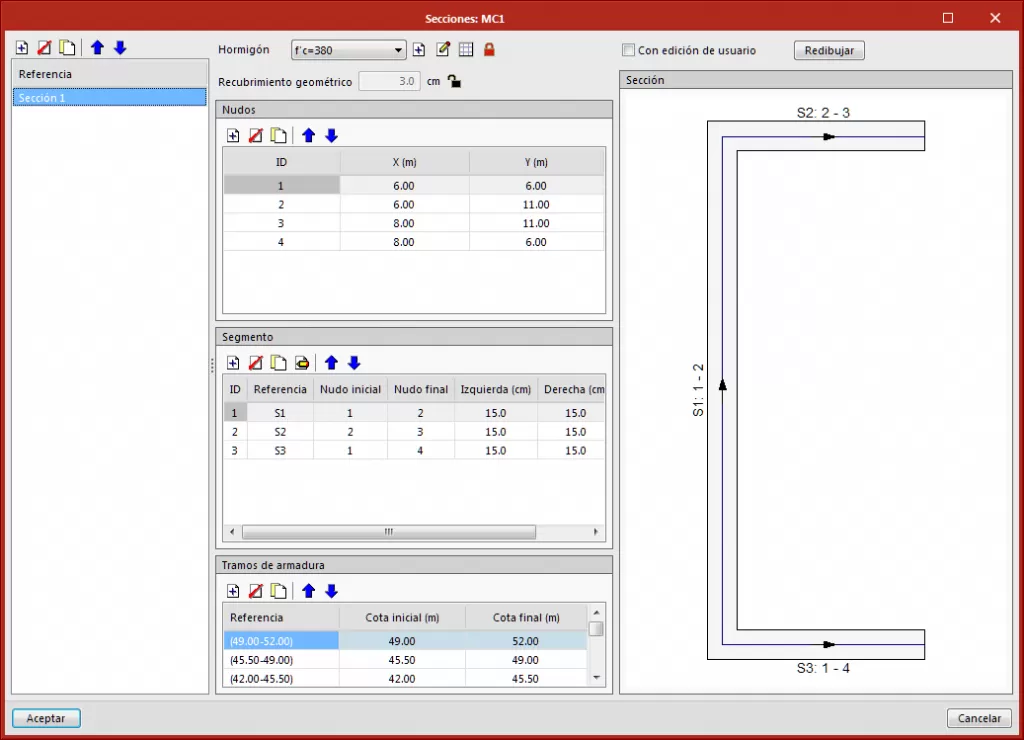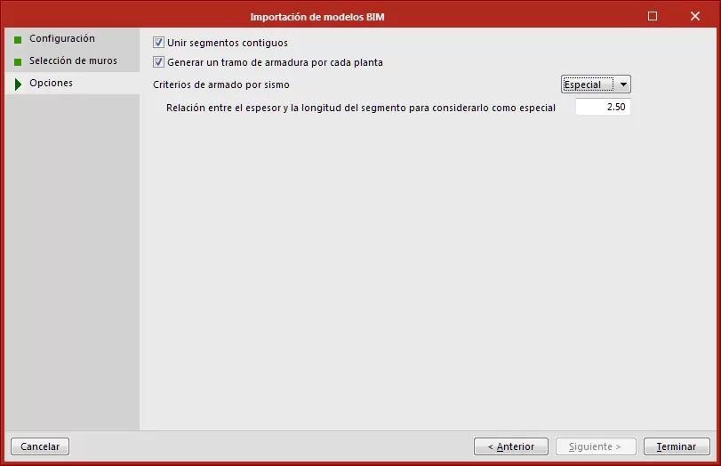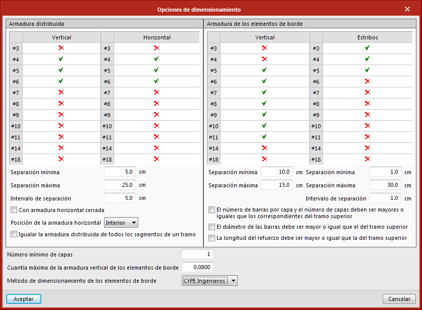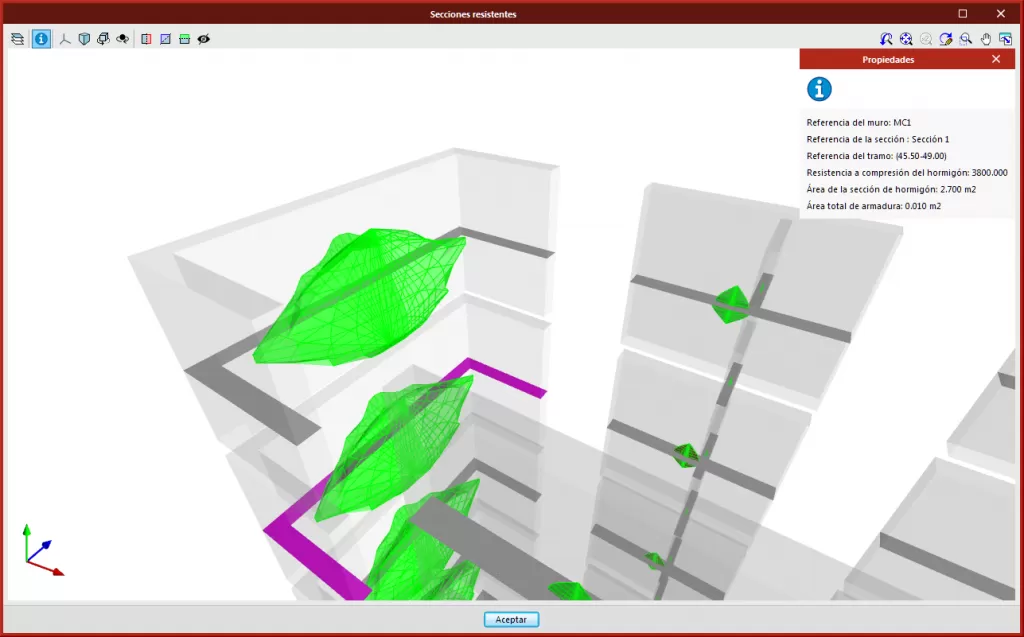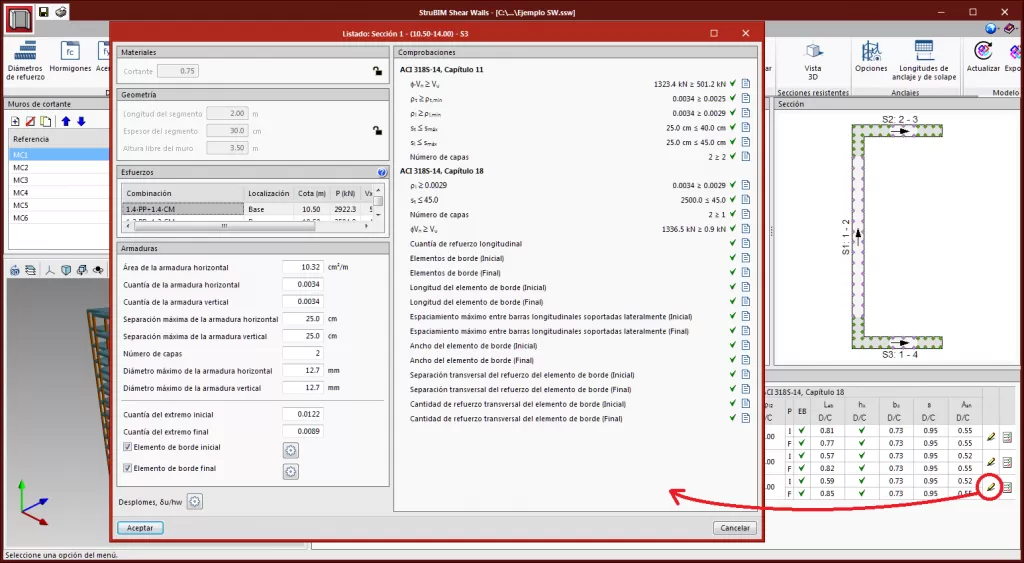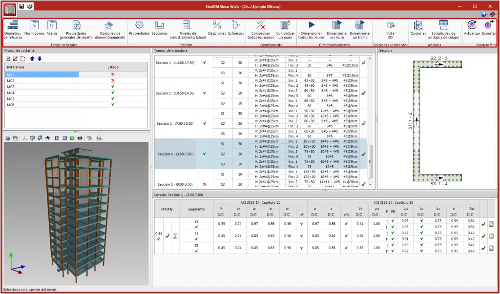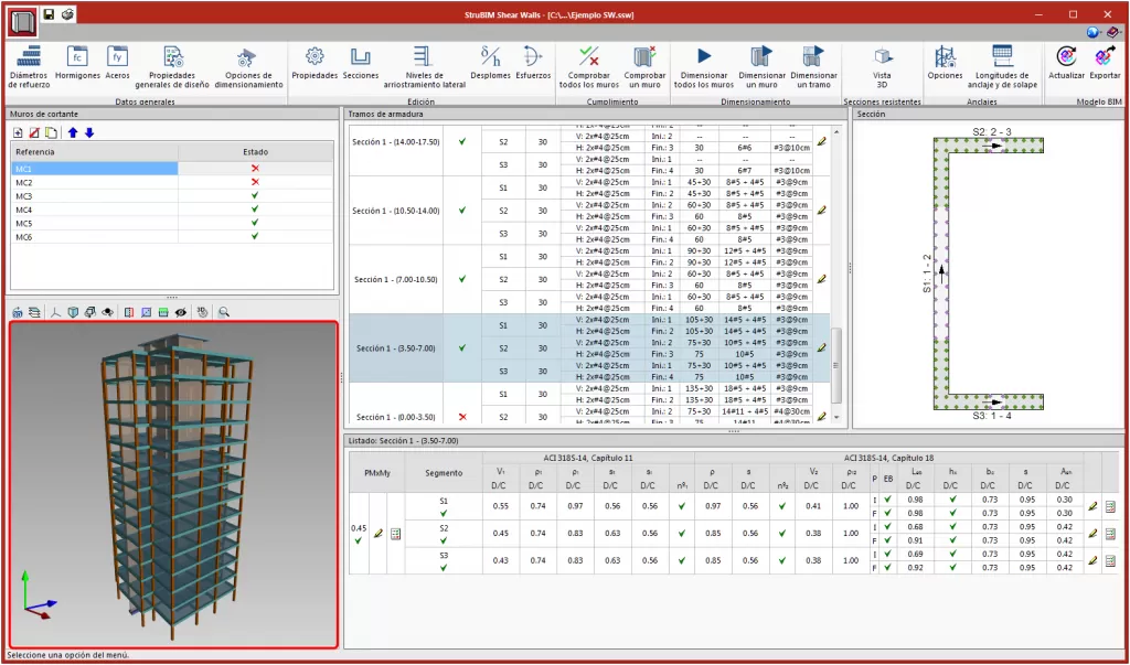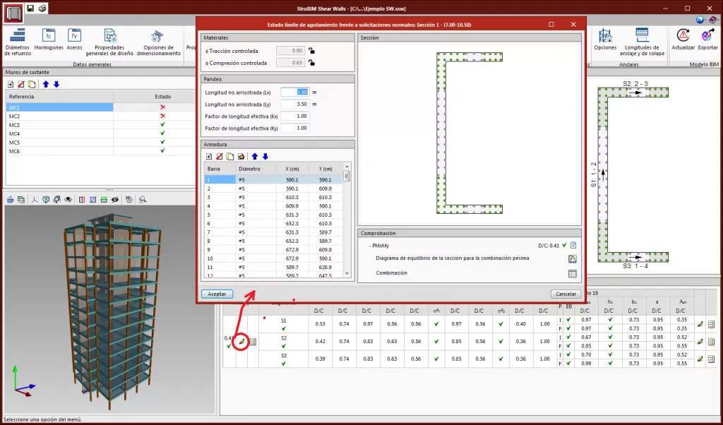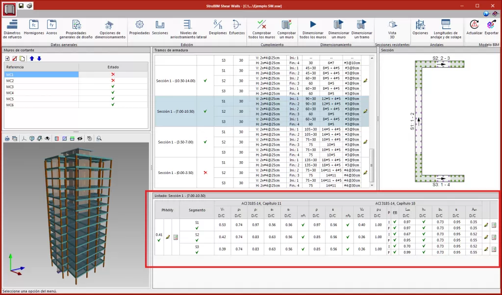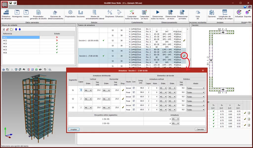 每个截面所需的钢筋可以从“StruBIM剪力墙”导出到BIM模型。钢筋导出文件中包含钢筋选项以及本节中定义的锚固长度和搭接长度等数据。